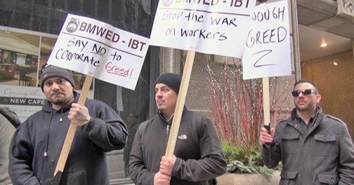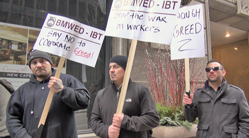 As railroad industry corporate executives held their conference at the Union League Club of Chicago, a militant protest took place outside on the sidewalk. It was organized by BMWED – IBT, other railroad workers groups and community activists on March 12, 2018. They alerted the public to the alarming statistics on railroad safety, taking the lives of railroad workers and of people living in communities the trains travel through. Chicagoland, they pointed out, “is the primary rail hub for North America’s sensitive cargo supply chains”. Deaths and injuries could be avoided if the industry were forced to stop skimping on needed maintenance in their gluttony for profits.