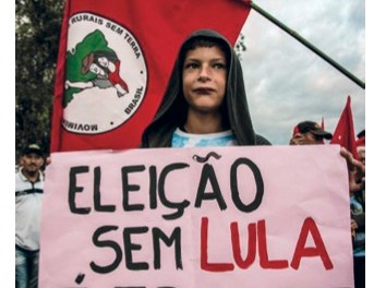 Activist with the Landless Peasants Movement (MST) holds sign stating that, "An Election Without Lula Is Fraud."