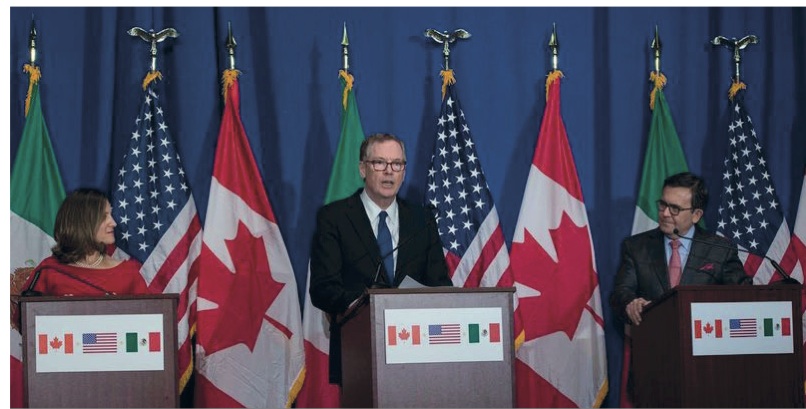 Trade representatives (left to right) from Canada, the United States and Mexico report on Sept. 30 signing of the USMCA.