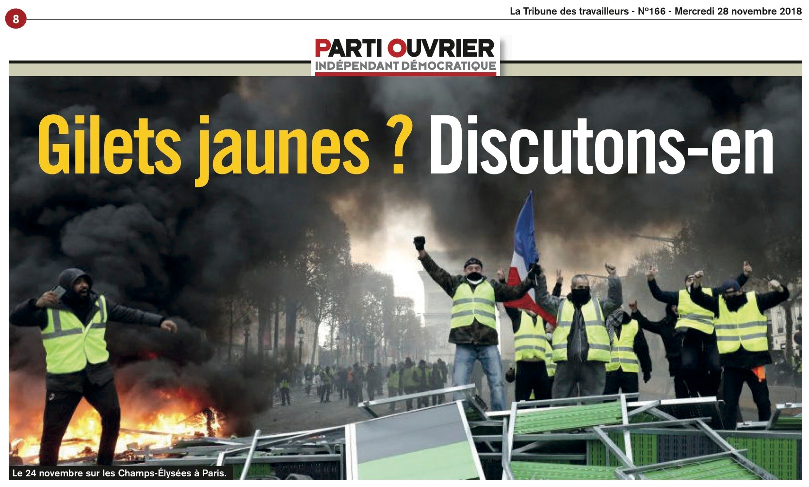 Again, is the “Yellow Vests” movement a model of “popular self-organisation”, as many people say? As this issue of our newspaper goes to press, eight national “spokespersons” have proclaimed themselves on Monday 26 to be the movement’s leaders. Other spokespersons are contesting these proclaimed leaders. Who can have us believe that all this is spontaneous? There are political forces, there are social forces involved: Among the eight designated spokespersons, one is close to a Nazi group, another is a former candidate of the FN. Another, a CFDT union delegate, was dismissed by the other seven for “lack of neutrality”.