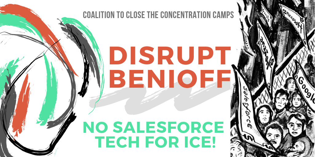 Salesforce CEO Marc Benioff is speaking today on “Business as the Greatest Platform for Change” posing as the leader of a “socially responsible” and financially successful company. Yet by continuing to support, enable and profit from the war on immigrants by providing software and technical services to CBP (Customs & Border Protection), Benioff and Salesforce are conducting business as usual.