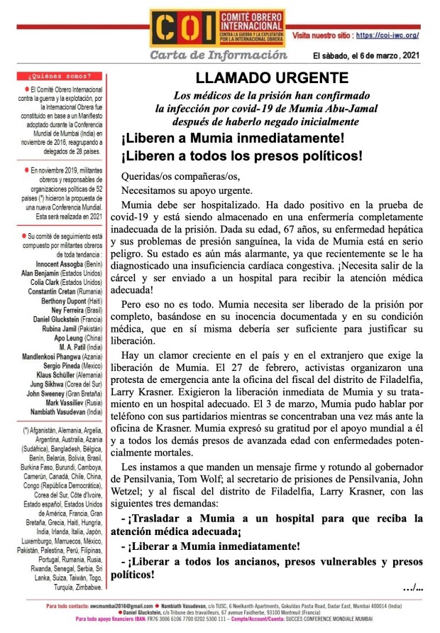 Nosotros, entidades y participantes del movimiento sindical, político y popular, intelectuales y personas comprometidas con la democracia y la justicia, nos dirigimos a ustedes para apelar por la vida del activista negro Mumia Abu Jamal, probado con Covid-19 y en tratamiento en un pabellón de prisión. situación totalmente inadecuada para su salud. El traslado inmediato de Mumia a un hospital es una medida urgente donde las horas cuentan para su supervivencia.