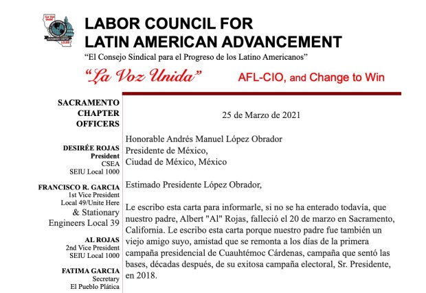 I write you this letter to inform you, if you have not already heard, that our father, Albert “Al” Rojas, passed away on March 20th in Sacramento, California. I write you this letter because our father was also a longtime friend of yours, going back to the days of the first presidential campaign of Cuauhtémoc Cárdenas — a campaign that laid the groundwork, decades later, for your successful election campaign in 2018.