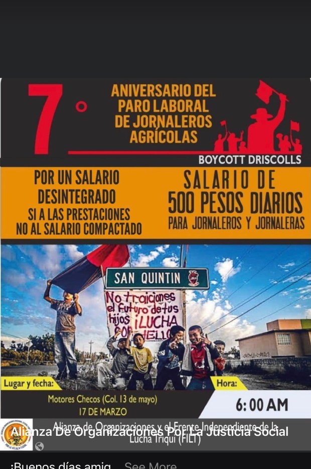 This seventh-year anniversary is a reminder that the farmworker demands have not been met and that the struggle continues. The workers of San Quintin are demanding a decent wage of 500 pesos (US$25.68). Even this sum is insufficient.