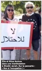 (Elie and Nitza Aminov, sign reads, “No to Occupation!”)
