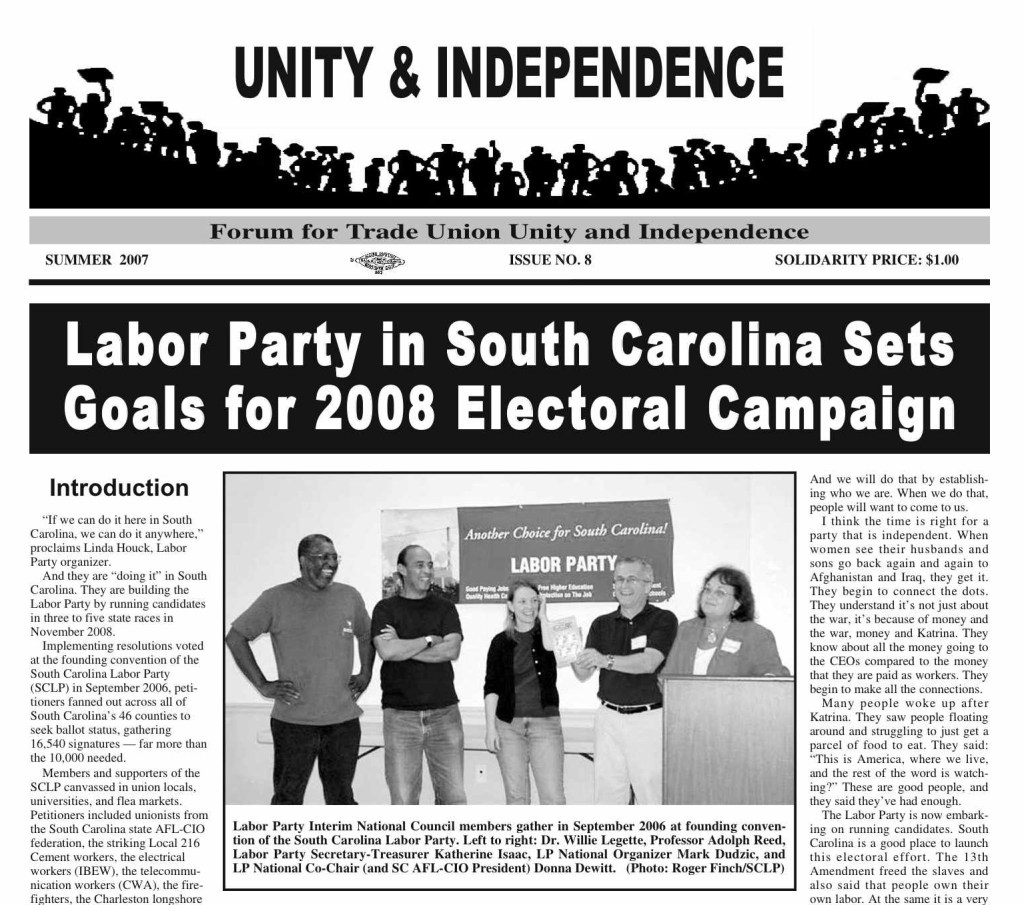 One of the most positive developments during this entire 1996-2007 period was the decision by the Labor Party Interim National Council (INC) to help then South Carolina AFL-CIO President Donna Dewitt launch the South Carolina Labor Party as a registered electoral party that is required to run candidates every four years to keep its ballot status. Dewitt was a member of the Labor Party’s INC and a long-time advocate of a Labor Party that runs candidates against Democrats and Republicans with the goal of winning elections and challenging for power.