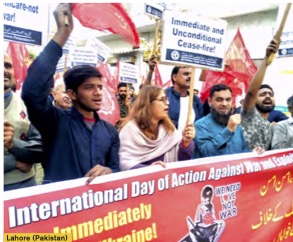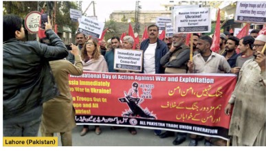 On 10 December, a street demonstration was held in the industrial city of Lahore, Pakistan, which was widely reported in the press the following day. Our correspondents report: “The All Pakistan Pakistan Trade Union Federation (APTUF) demonstrated as part of the International Day of Struggle against War and Exploitation. Workers from the private sector and the railways participated. The march was led by Rubina Jamil, Anwer Gujjar, Nasir Gulzar and Muhammad Ilyas. The demonstrators chanted: ‘Russian troops out of Ukraine, NATO troops out of Europe and other countries!’, ‘Billions for salaries, school and health, not for war!’, ‘We want peace, work, bread, not war’, etc. Rubina Jamil and Nasir Gulzar addressed the rally to reiterate that we, workers, peasants, students, teachers, demand an immediate end to the war, to stop pouring billions of dollars into this war while in some countries children and human beings are losing their lives for lack of food and basic health services.”