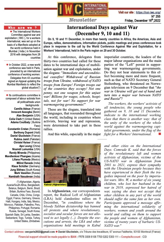 In Afghanistan, our correspondents report, the Left Radical of Afghanistan (LRA) held clandestine rallies on 9 December, “in conditions where the bloody Taliban dictatorship has banned all protests and where revolutionary, socialist and secular forces are not allowed to act legally … . Despite the executions and arrests, the LRA and other organisations held meetings in Kabul and other cities on the International Days.