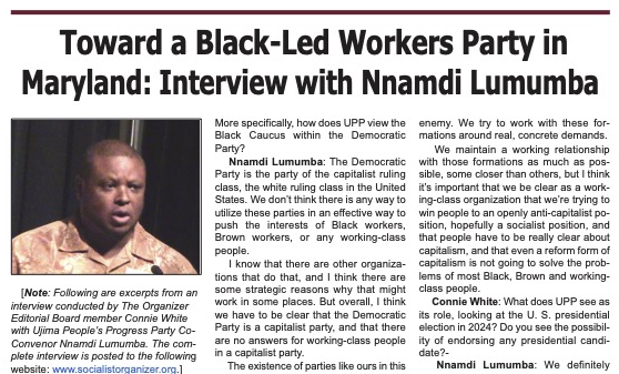 [Note: Following are excerpts from an interview conducted by The Organizer Editorial Board member Connie White with Ujima People’s Progress Party Co-Convenor Nnamdi Lumumba. The complete interview is posted to www.socialistorganizer.org.]