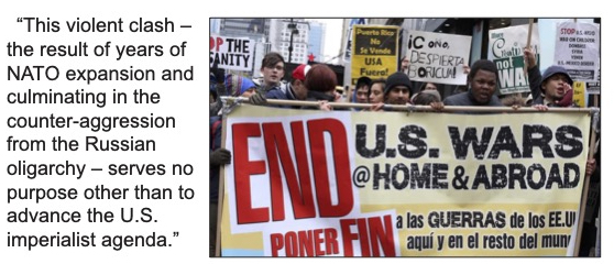 We must fight for an end to the war ourselves. Toward that end, we demand an immediate ceasefire! All troops must leave Ukraine! Money for jobs, education, healthcare and social services – NOT war!