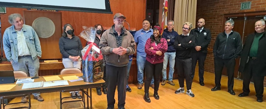 Sarah and I were given 5 to 7 minutes to make presentations to the gathering. I took the opportunity to present a sort of “farewell address.” Having just moved back to New York City, I felt the need to call on Labor Council delegates and S.F. community activists to continue, and, if possible, expand some of the important campaigns that we organized jointly over the 32 years that I was a Council delegate representing OPEIU Local 29, 17 of those years on the Council’s Executive Committee.