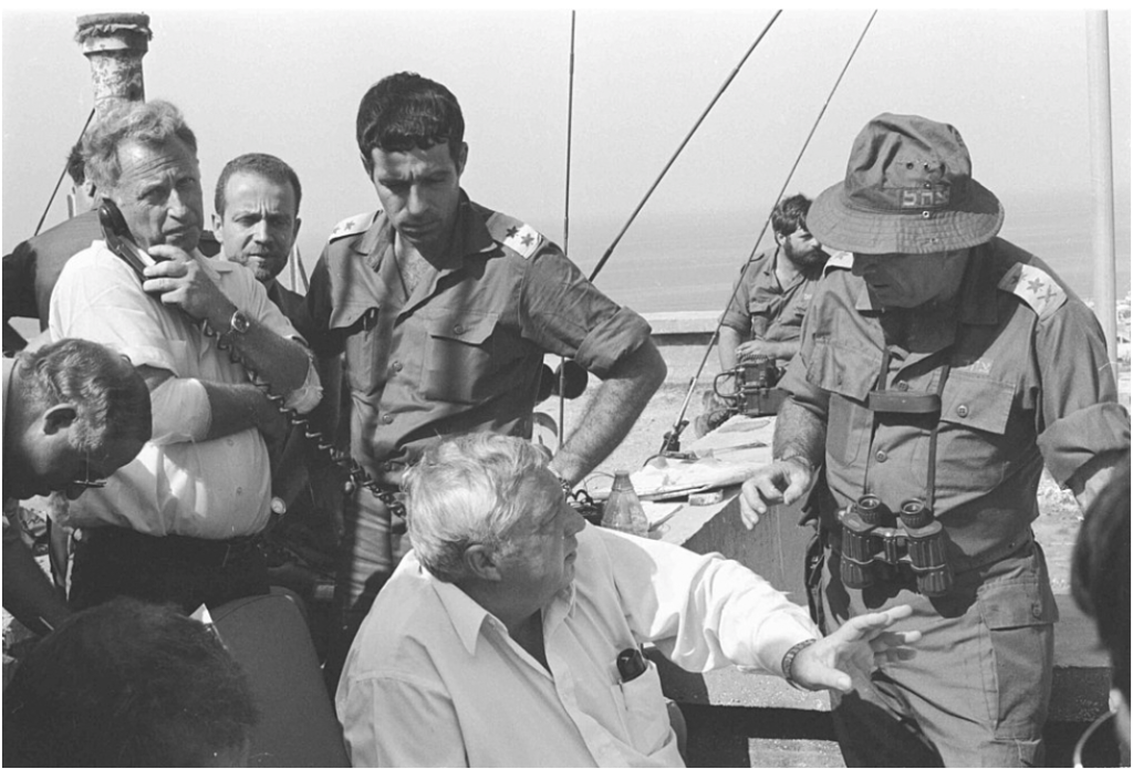 Chief of Staff Rafael Eitan is on the phone while Defense Minister Ariel Sharon is center giving battle instructions for the 1982 Israeli attack on and occupation of Lebanon.