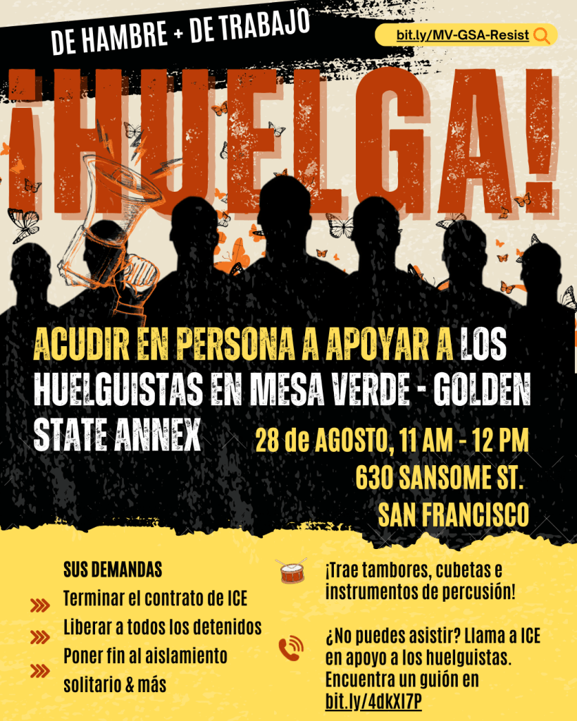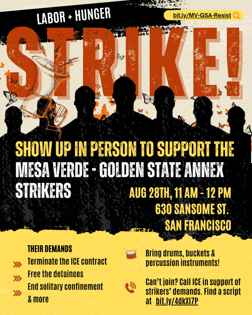 At a protest in San Francisco Wednesday outside the office of the U.S. Immigration and Customs Enforcement agency, several dozen activists called on the agency’s field director to meet with detainees who are waging hunger and labor strikes inside two Kern County facilities: Mesa Verde ICE Processing Center and Golden State Annex.