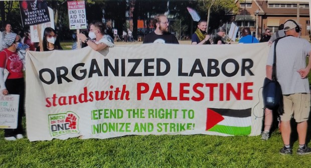 Independent voices of union activists, however, were heard in Chicago’s streets throughout the four-day convention. The Real News Network spoke withs unionists gathered behind a banner that read: “Organized Labor Stands with Palestine.” A Chicago teacher unionist told TRNN:’